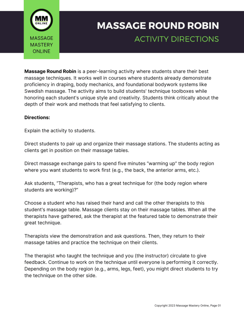 Massage Round Robin is a peer-learning activity where students share their best massage techniques. It works well in courses where students already demonstrate proficiency in draping, body mechanics, and foundational bodywork systems like Swedish massage. The activity aims to build students’ technique toolboxes while honoring each student’s unique style and creativity. Students think critically about the depth of their work and methods that feel satisfying to clients.