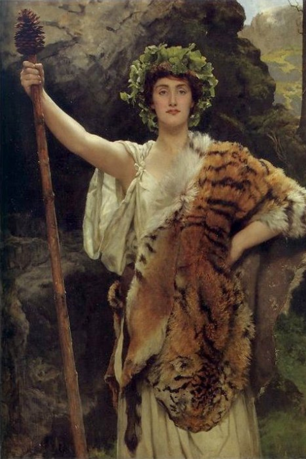 On a side note, the image at the left is called the Priestess of Bacchus (1885-1889) by British Pre-Raphaelite painter John Collier. Bacchus is the Roman God of the grape harvest, wine, music, and ecstasy (The Greek version is Dionysus). Devotees of Bacchus were called Bacchante or Maenads, which means “raving ones” in Greek, because the Maenads danced themselves into a frenzy and ended a night of revelry far from home. Grape plants and wine are associated with the spiral of self and the search for self and represent freedom from society’s constraints and fears.