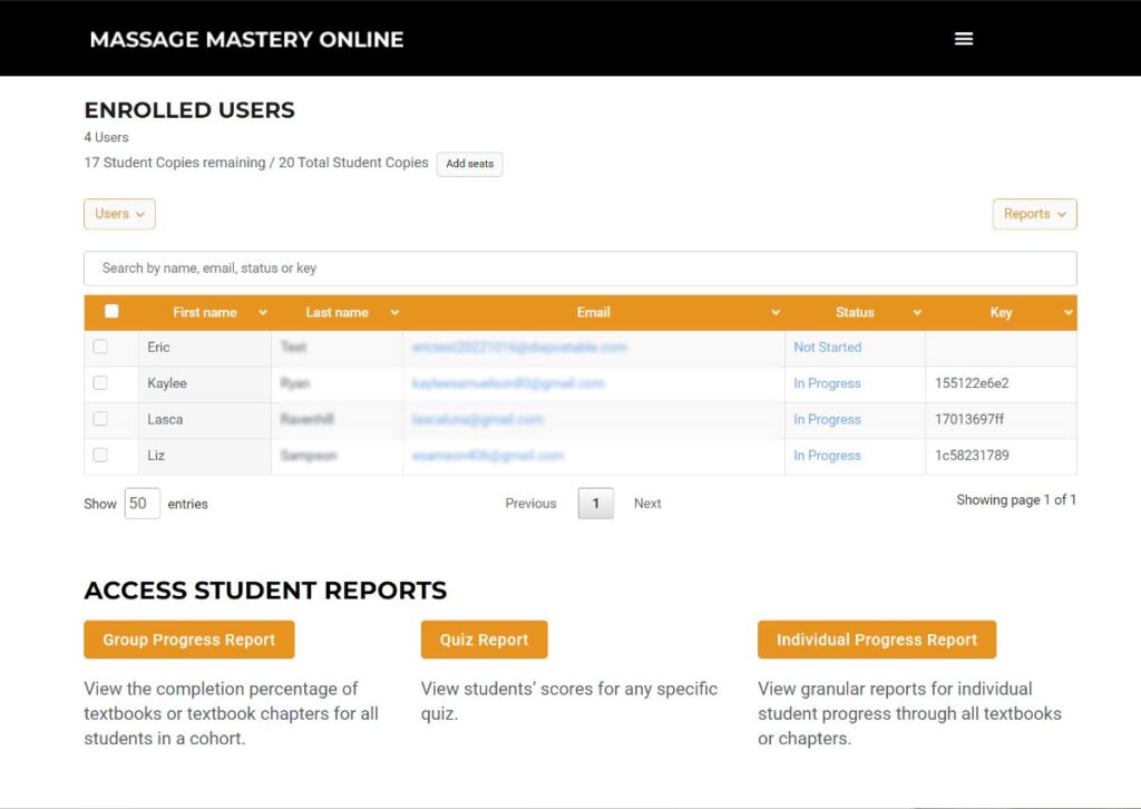 At Massage Mastery Online you can monitor student progress to the level you desire. You can confirm if they’ve read an assigned topic or check what questions they got right or wrong on any quiz.Â