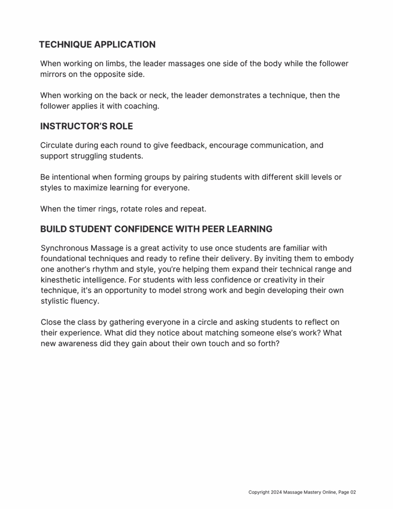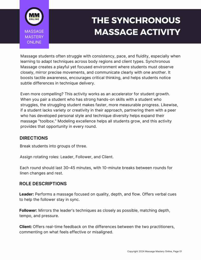Synchronous Massage is a great activity to use once students are familiar with foundational techniques and ready to refine their delivery. By inviting them to embody one another’s rhythm and style, you’re helping them expand their technical range and kinesthetic intelligence. For students with less confidence or creativity in their technique, it’s an opportunity to model strong work and begin developing their own stylistic fluency.