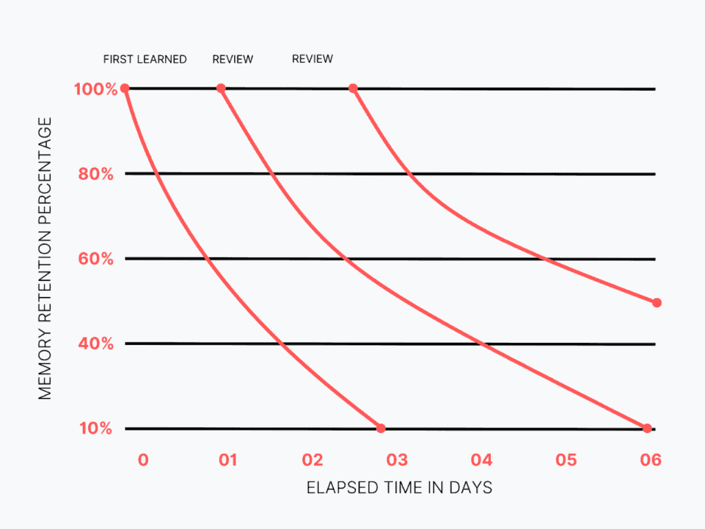 The forgetting curve illustrates the decline of memory retention over time. Ebbinghaus discovered a steep, significant decline in information retention soon after learning. The curve gradually flattens out, indicating that memory loss decreases over time. The traces of information retained after the initial loss remain resilient. Additionally, each time a person revisited or repeated information, the forgetting curve for that information was less pronounced, leading to increased retention over longer periods. Ebbinghaus found that the initial strength of the memory and how well a person encoded it through comprehension and active learning played a role in how quickly they forgot information. Memories tied to emotions or reinforced through learning activities and quizzing tend to deteriorate more slowly.