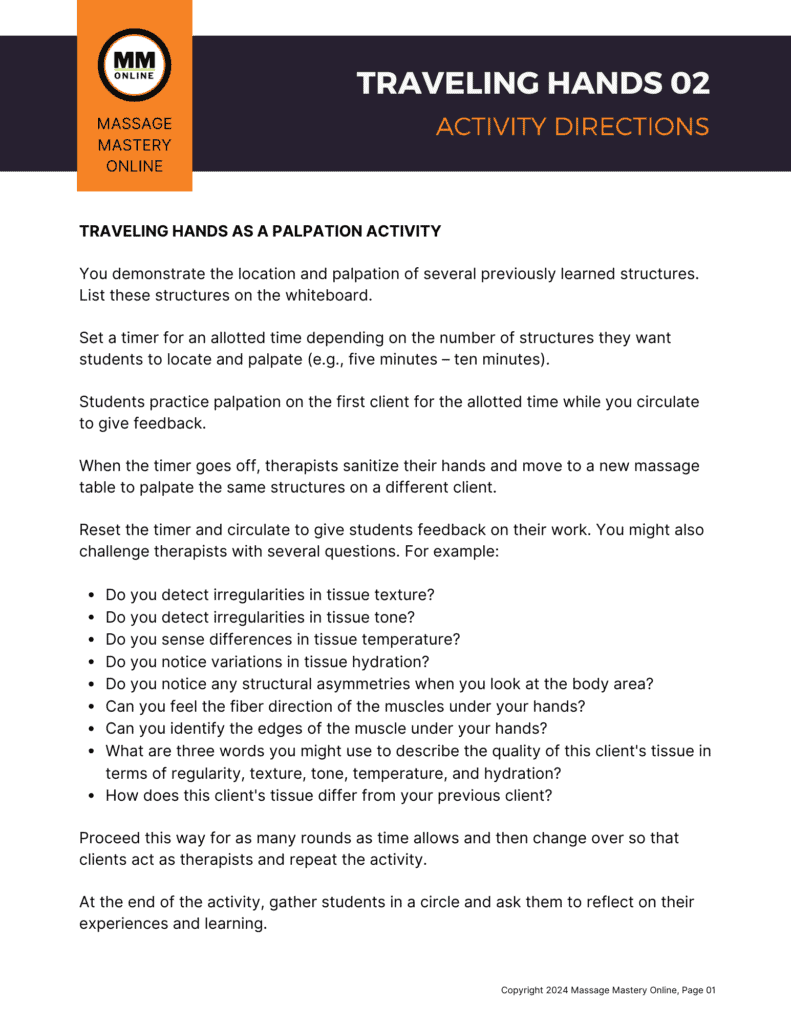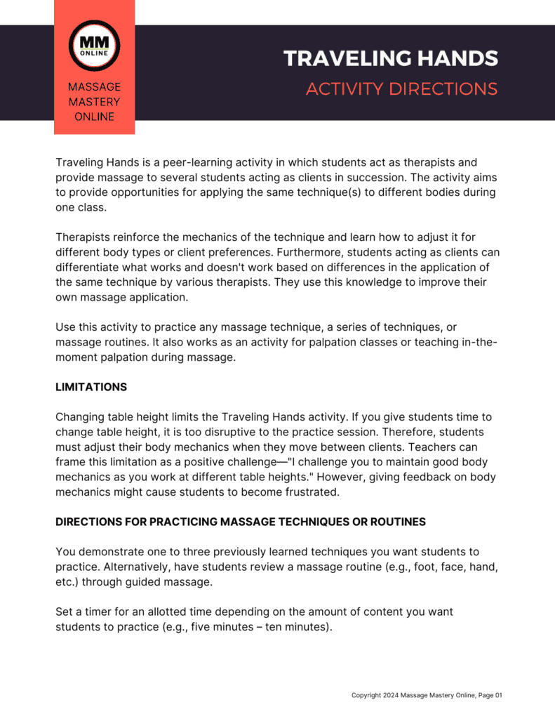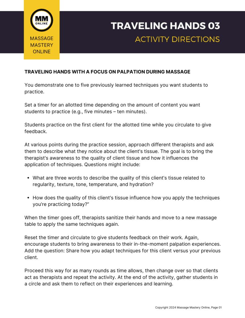 Traveling Hands is a peer-learning activity in which students act as therapists and provide a massage to several students acting as clients in succession. The activity aims to provide opportunities for applying the same technique(s) to different bodies within a single class.